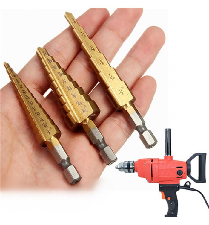 3pcs HSS Step Drills 1/4 Inch Hex Shank Titanium Coated Step Drill Bit Set